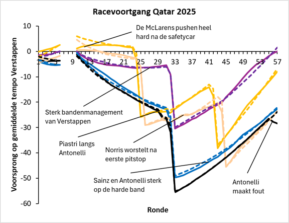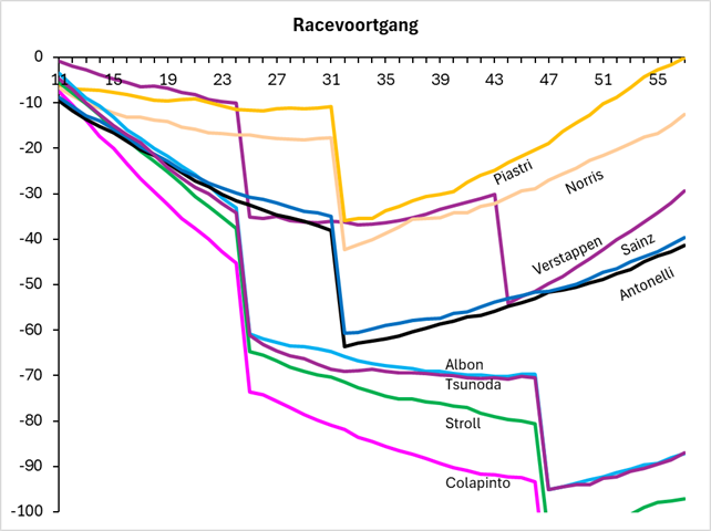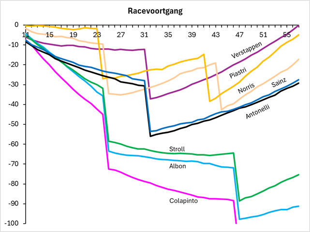 Ronde 44-57: Verstappen neemt wat gas terug als blijkt dat Piastri hem toch niet kan bedreigen. Norris zit klem op de vijfde plaats, totdat Antonelli een foutje maakt, waardoor hij vierde wordt (en aan een podiumplaats in Abu Dhabi genoeg heeft voor de titel).