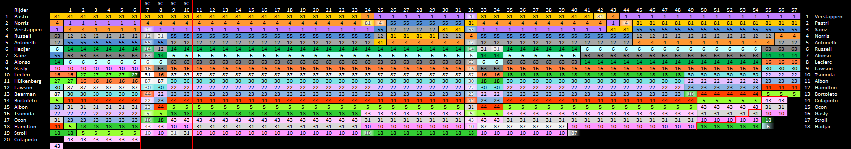 Verstappen wint nog steeds, zij het met iets minder marge. Grappig genoeg stelt Norris in deze simulatie wel de derde plaats veilig, omdat Sainz en Antonelli aan het begin van de race op grotere achterstand worden gereden. Volgens het model heeft Verstappen op zijn nieuwere banden weinig moeite met Albon, Stroll en Colapinto. Een beperking van het model is dat, wanneer het veld dicht op elkaar zit, een snelle auto makkelijk hele groepjes in een keer voorbijrijdt omdat al die auto’s in elkaars turbulente lucht zitten. Daarom heb ik aangenomen dat er bij de herstart steeds een seconde tussen de auto’s zat, wat veel meer is dan het in werkelijkheid was. Het vertraagt de opmars van de snelle auto’s wel wat, maar niet heel veel. Waarschijnlijk had Verstappen in het echt meer moeite gehad om zich naar voren te knokken, waardoor hij de overwinning wellicht aan Piastri had verloren.