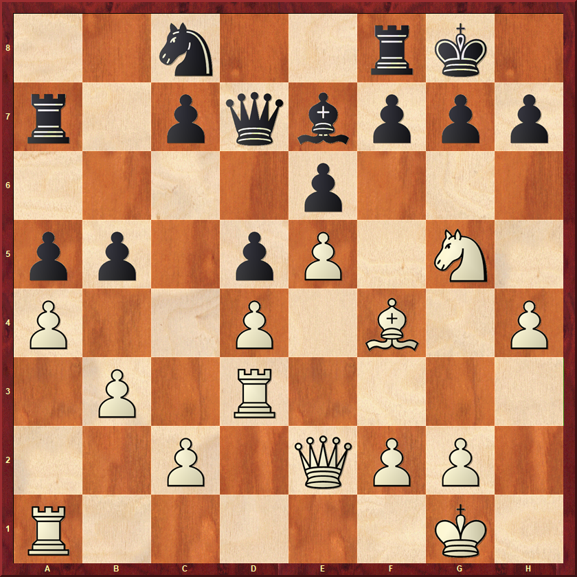 Wit dreigt het paard in te sluiten met 18.c3 en om dat te voorkomen kan zwart ruimte maken voor het paard met 17…b4 of 17…Pe7. In plaats daarvan creëerde hij een gat op d5 met 17…e5? Mark profiteerde meteen: 18.c3 Pe6 19.f5! Pc7 20.Pe3. Zwart stribbelde tegen met 20…Lh6 21.Td1 Pd4!? 22.Dd3 c4!?, maar na 23.Dd2! valt d6 uiteindelijk. Mark ging voor het eveneens veelbelovend ogende stukoffer 23.Pxc4?, maar dat was niet duidelijk na 23…bxc4 24.Dxd4+ d5! 25.exd5 Pxf5 en zwart staat een stuk tegen twee pionnen voor.