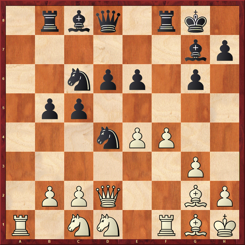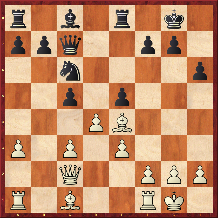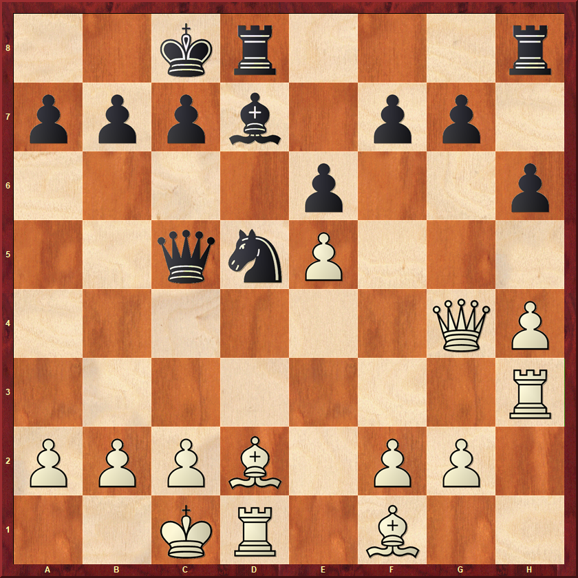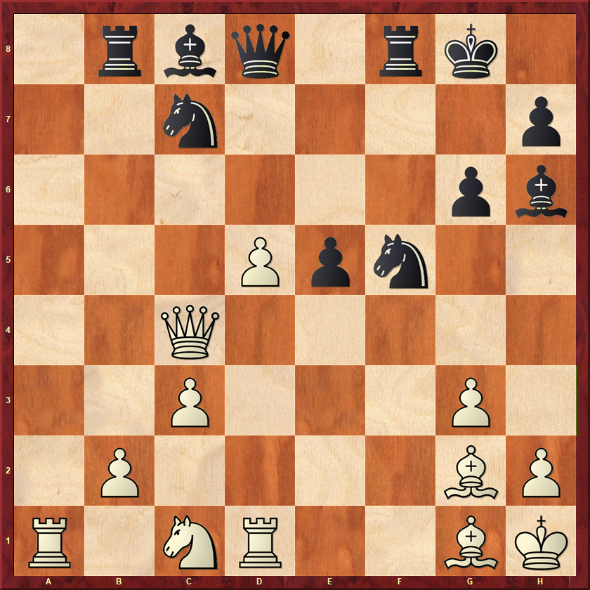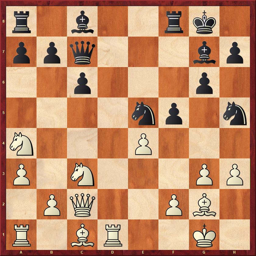 Wit heeft zojuist op e4 een stel paarden geruild. Ik was hier een beetje bang voor wits lopers. Ik wilde voorkomen dat wit zijn zwartveldige loper zou activeren, dus speelde ik 15…Pa5 16.Td1 c4! Die loper blijft voorlopig passief. Ik heb hier nog een tijd zitten kijken naar 17.d5 Pb3 18.d6?! Pxa1 19.dxc7 Pxc2 20.Td8, maar dat is onzin. Zwart heeft meerdere winsten, maar 20…Le6 is het overtuigendst. Wit kan niet en op b7 slaan en op c2. 21.Lxb7 Tc8! (niet gezien dat het zo sterk zou zijn) 22.Lxc8 Lxc8 wint dan gewoon. Het paard ontsnapt via a1 of e1. In plaats daarvan kwam 17.Tb1 Pb3 18.Ld5 Le6 19.Lxe6 Txe6 20.d5 Ta6!? Voorkomt dat wit zijn loper gaat activeren met a3-a4. Zwart heeft een goed paard tegen een slechte loper en staat beter. In de tijdnoodfase wist ik dit zonder echt brokken te maken in een punt om te zetten.