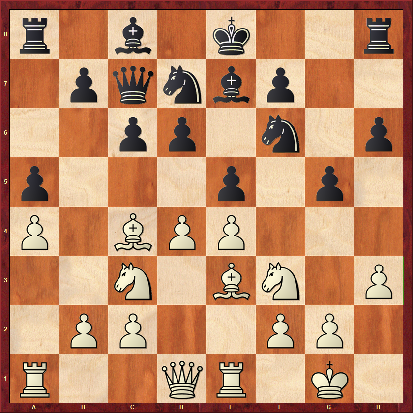 In plaats van het profylactische 11.Pd2 besloot wit tot de mysterieuze torenzet 11.Tb1? Timon reageerde natuurlijk met 11…g4 12.Ph4 Pb6! 13.Le2 gxh3 14.g3 en zwart heeft een aanval tegen wits koning, terwijl wit aan de andere kant nog niks voor elkaar heeft gekregen. Helaas besteedde Timon daarna veel bedenktijd aan een speculatief paardoffer en dat brak hem later op. Nadat hij zijn voordeel was kwijtgeraakt, bleef hij geforceerde zetten spelen en vocht hij zichzelf steeds harder naar een nederlaag. Zonde!