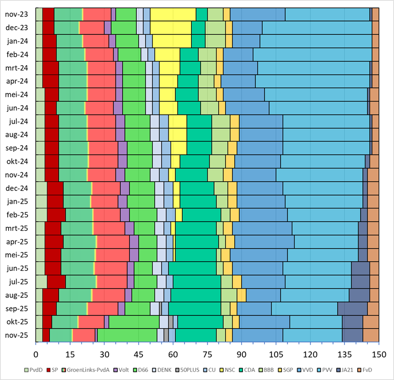 Te zien is hoe de aanhang van NSC geleidelijk aan is weggesmolten, terwijl in dezelfde periode de aanhang van het CDA groeide. Verder is te zien dat de VVD het direct na de verkiezingen heel slecht deed en dat deze virtuele zetels vooral naar de PVV gingen, dat begin 2024 rond de 50 zetels werd gepeild. Inmiddels is de PVV ten opzichte van dat hoogtepunt gehalveerd. Een deel van de kiezers stapte over naar de VVD, een ander deel naar Ja21 en FvD. Aan de linkerkant van het spectrum is goed te zien hoe de D66 de andere linkse partijen heeft opgegeten. Al met al groeide links iets ten koste van de middenpartijen (het CDA haalde minder stemmen dan NSC 2 jaar geleden), terwijl (nationalistisch) rechts stabiel bleef.