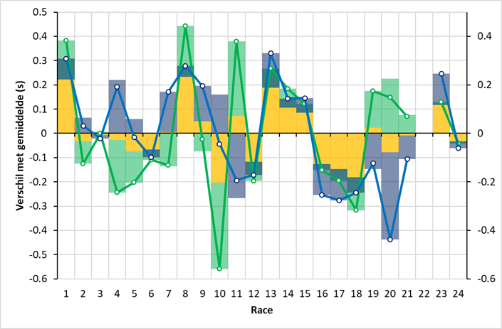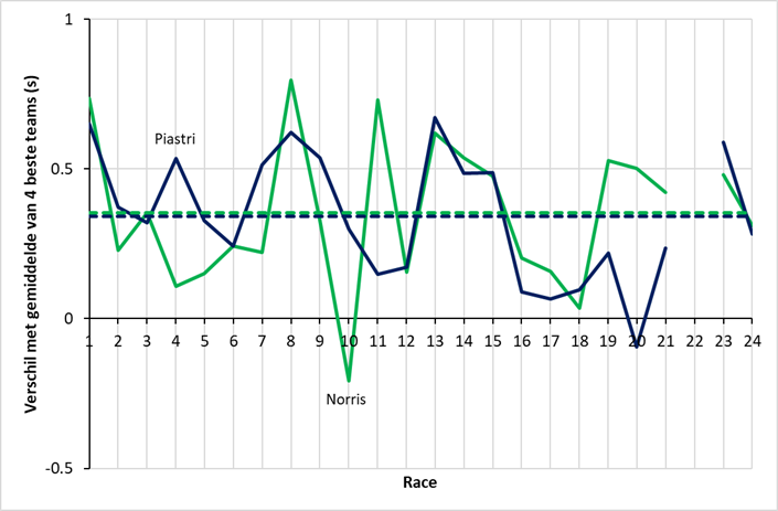 Gemiddeld was Norris een fractie sneller dan Piastri (0,35 om 0,34 seconde sneller dan de gemiddelde coureur van de vier topteams, zie de stippellijnen). De pieken in de eerste race (Australië), alsmede die in race 8 (Monaco) en de zwakkere optredens tegen het eind van het seizoen vallen op. Daarnaast valt Norris’ zwakke optreden in race 10 (Canada), gevolgd door zijn sterke optreden in Oostenrijk op. Piastri was alleen in race 20 (Mexico) trager dan de gemiddelde coureur van de vier topteams. De resultaten van het weekend in Las Vegas (race 22) heb ik vanwege de regen buiten beschouwing gelaten.