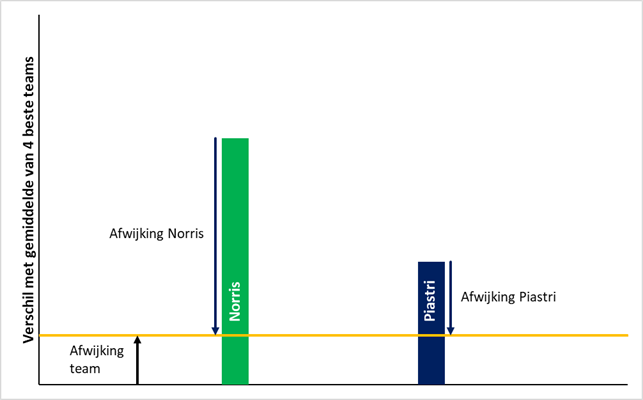 Te zien zijn de fictieve prestaties van Norris (groene balk) en Piastri (donkerblauwe balk) in een race, afgezet tegen het gemiddelde van de coureurs van de vier beste teams. Te zien is dat beide coureurs een goede sessie hebben afgewerkt. Een deel hiervan wordt verklaard door de auto (de oranje lijn) en een deel door de coureurs, die boven verwachting goed reden. De meest waarschijnlijke decompositie van de inbreng van het team en de coureurs minimaliseert de (voor standaarddeviatie gewogen) lengte van de pijlen. De onderstaande figuur geeft de meest waarschijnlijke decompositie per race: